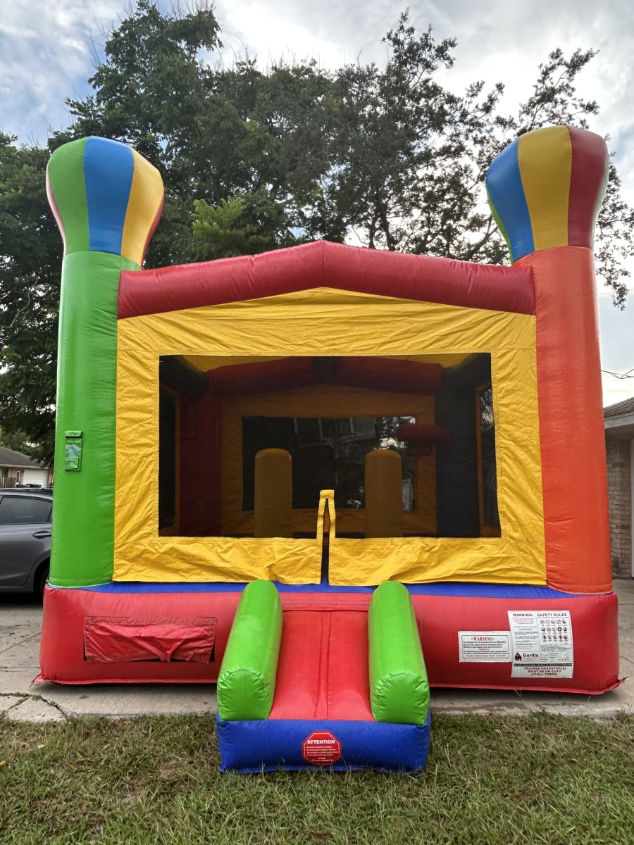 Blow up the party with this 14' Carnival Bouncer. Hop in, shoot some hoops, jump into the pylons, bounce around and have a blast. Generic Multi colors fits with any party theme.