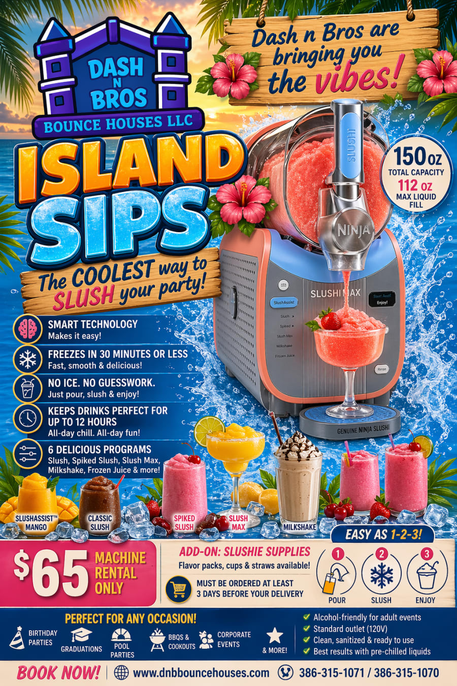 Bring the ultimate party upgrade to your next event with our Island Sips Slushie Machine — powered by the high-performance Ninja SLUSHi Max XXL.