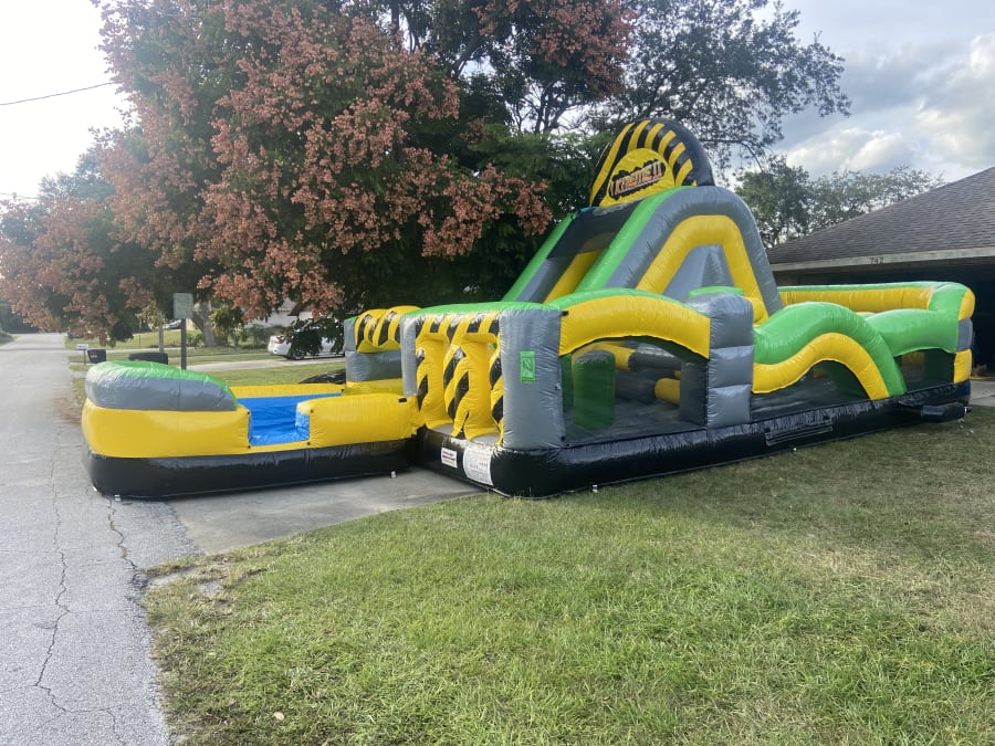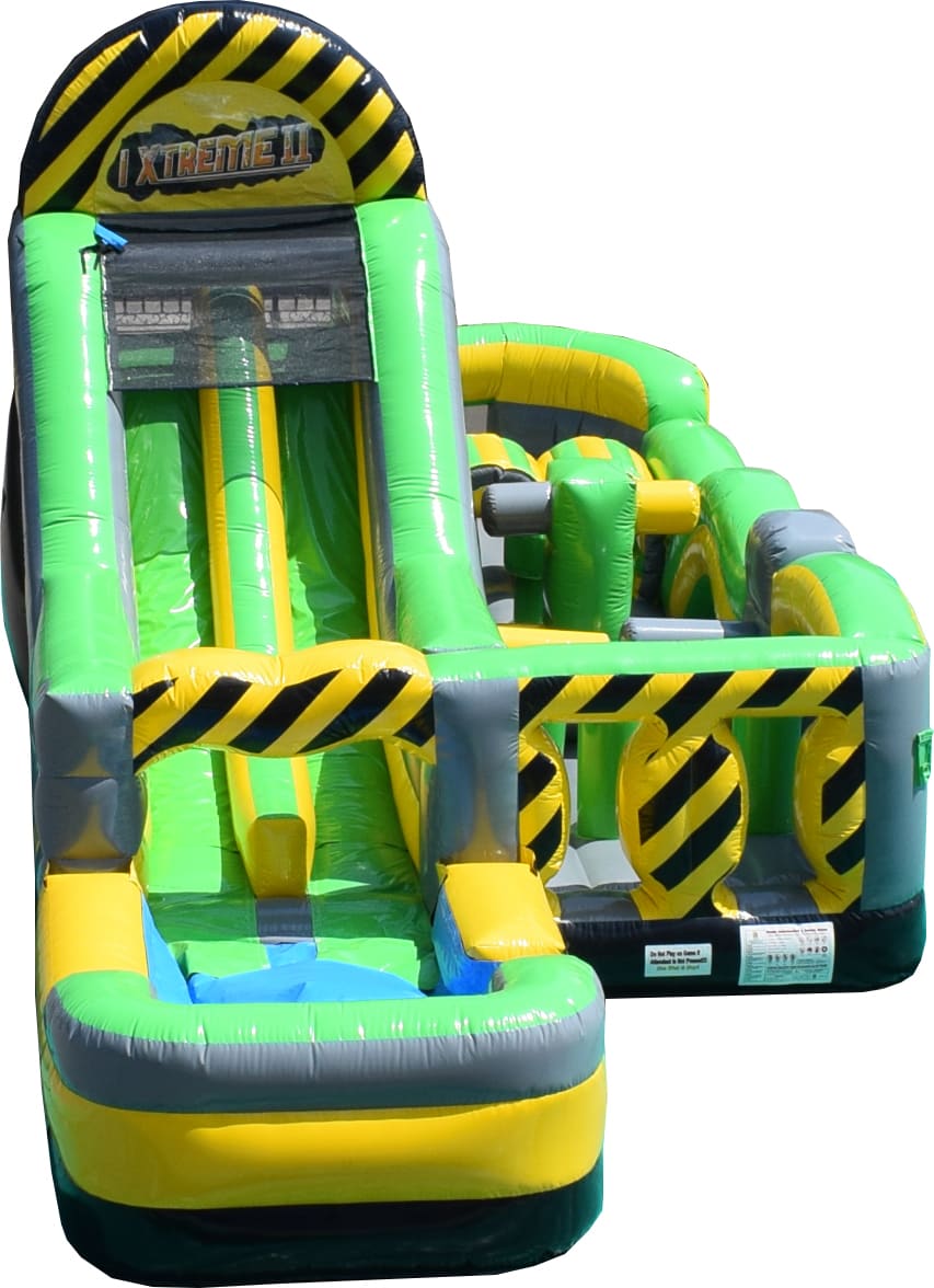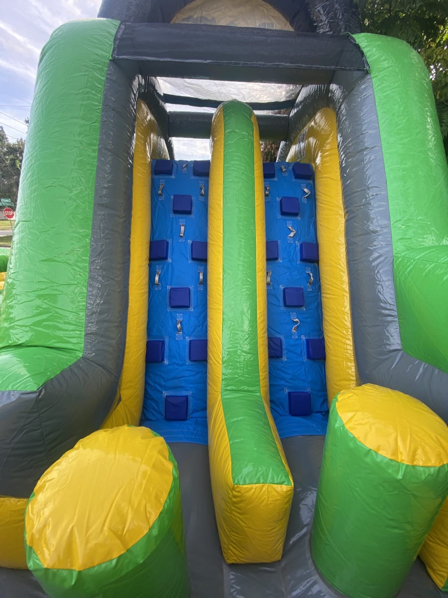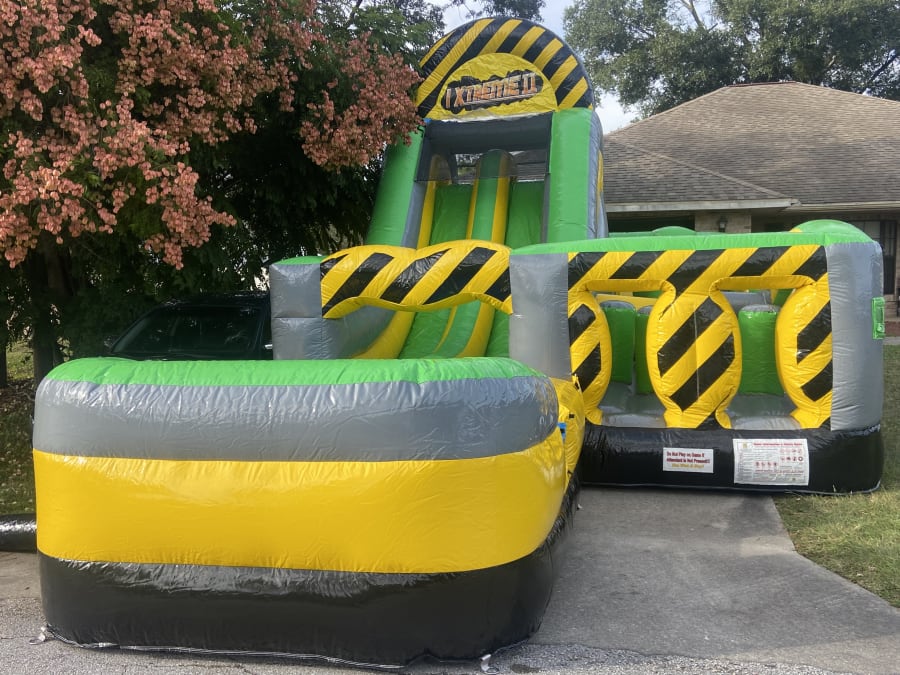 Experience our new 5 in 1 Xtreme Caution Obstacle Course -16FT Dual Lane Slide -Obstacle Course -Rock Climbing Wall -Pool -Bouncing Inflatable